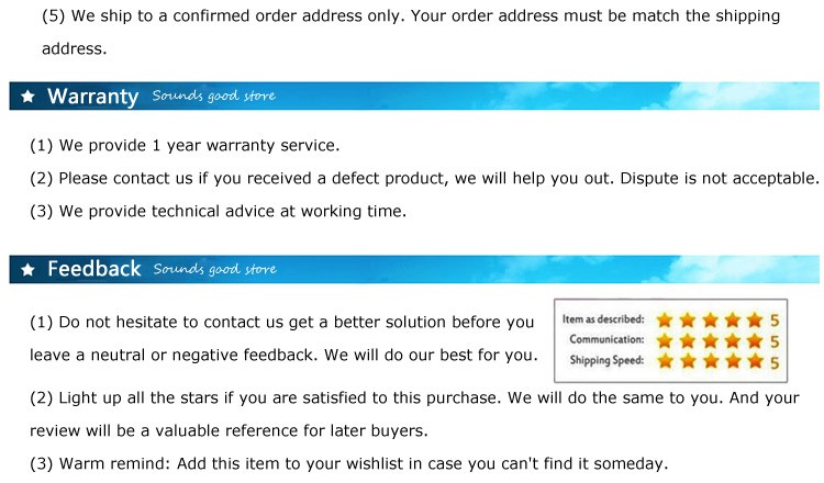 If the product you receive is not as described or low quality, the seller promises that you may return it before order completion (when you click "Confirm Order Received" or exceed confirmation timeframe) and receive a full refund. The return shipping fee will be paid by you. Or, you can choose to keep the product and agree the refund amount directly with the seller. N.B.: If the seller provides the "Longer Protection" service on this product, you may ask for refund up to 15 days after order completion. |