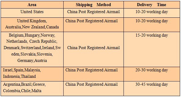 | Post Air Mail | Free Shipping | 15 - 45 days |