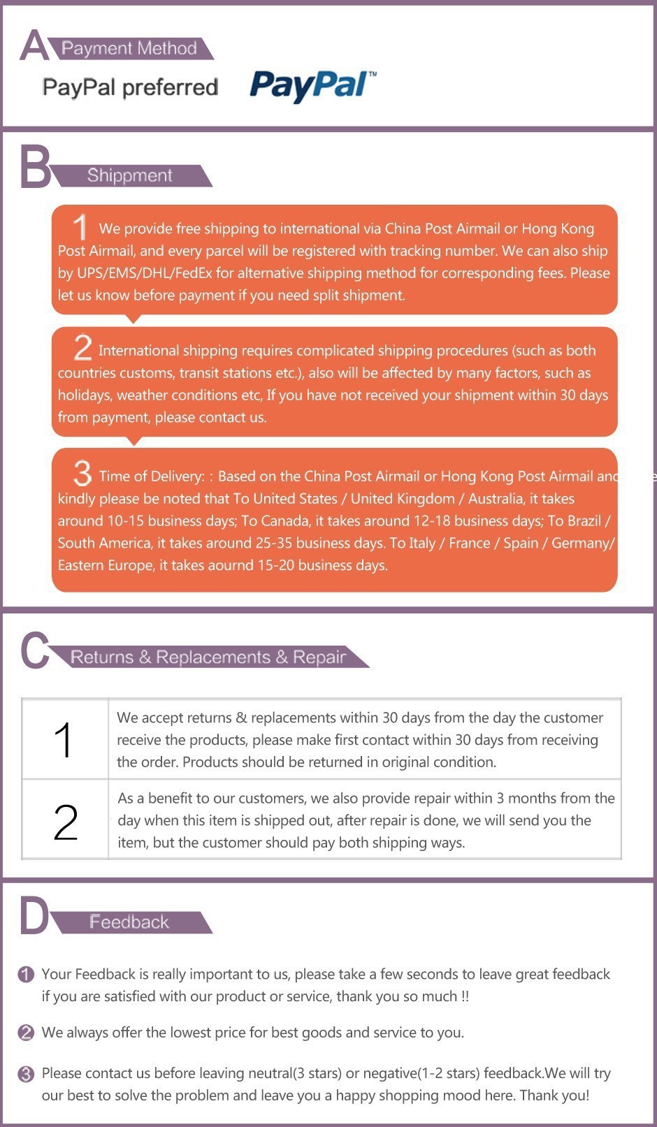 | Seller Service | On-time Delivery If you do not receive your purchase within 60 days, you can ask for a full refund before order completion (when you click "Confirm Order Received" or exceed confirmation timeframe). |