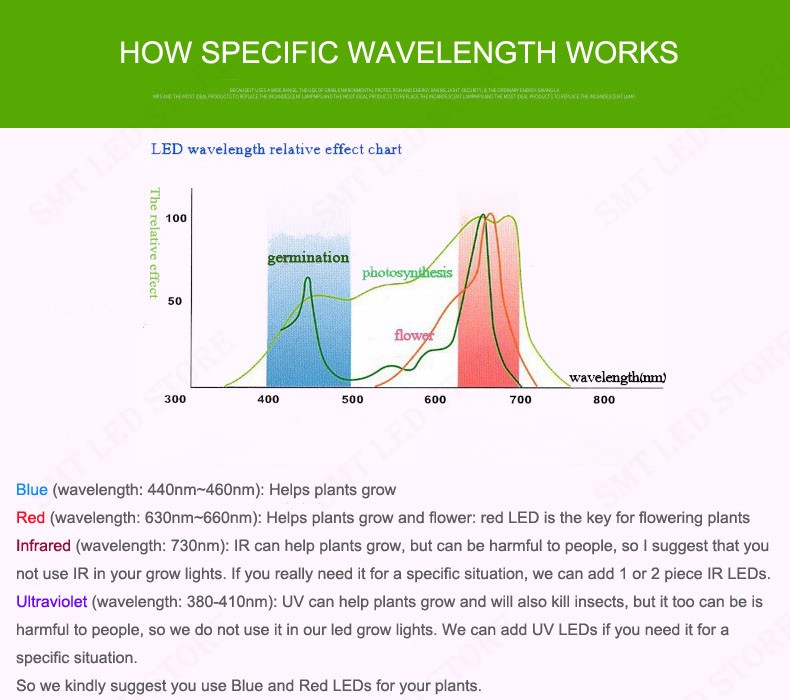 ir(ความยาวคลื่น: 730nm): irสามารถช่วยให้พืชเจริญเติบโต, แต่มันมากที่เป็นอันตรายต่อมนุษย์, ดังนั้นผมจึงขอแนะนำให้คุณdonotใช้irgrowlightsในของคุณ, แต่เราสามารถเพิ่ม1หรือ2ชิ้นไฟledirถ้าคุณต้องการมันจริงๆในสถานการณ์ที่เฉพาะเจาะจงของ
