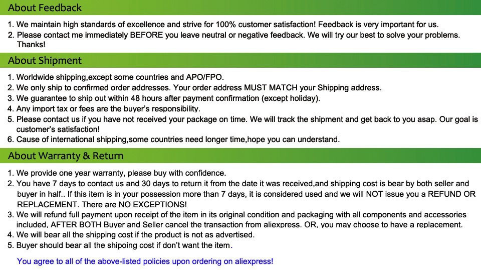 If the product you receive is not as described or low quality, the seller promises that you may return it before order completion (when you click "Confirm Order Received" or exceed confirmation timeframe) and receive a full refund. The return shipping fee will be paid by you. Or, you can choose to keep the product and agree the refund amount directly with the seller. N.B.: If the seller provides the "Longer Protection" service on this product, you may ask for refund up to 15 days after order completion. |