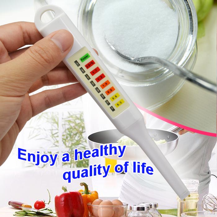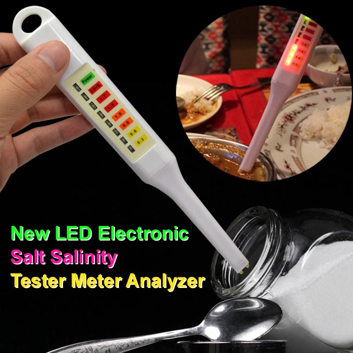 เกลือวิเคราะห์ใช้การนำทดสอบในการวัดเกลือเข้มข้นในอาหารเหลว.ดังนั้นเกลือเนื้อหาสามารถมาในการควบคุมการบริโภคประจำวันของเกลือและรักษาสุขภาพอุปกรณ์คุณสมบัติในtouch padควบคุมเจ็ดสีแดงสัญญาณไฟLED, LEDสีเขียวไฟแสดงสถานะใช้งานง่ายและง่ายใช้